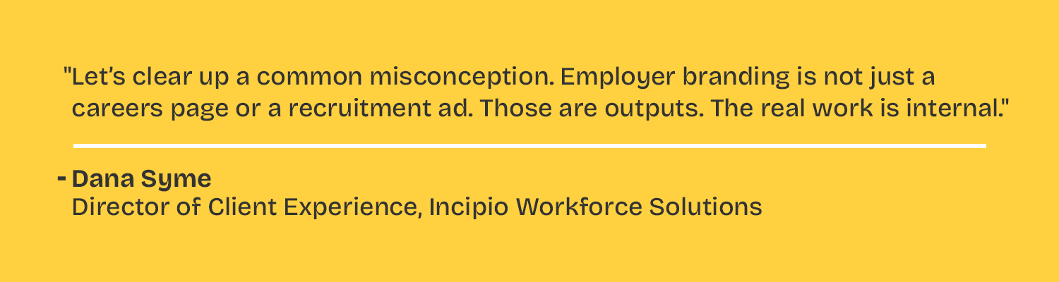 Let’s clear up a common misconception. Employer branding is not just a careers page or a recruitment ad. Those are outputs. The real work is internal.